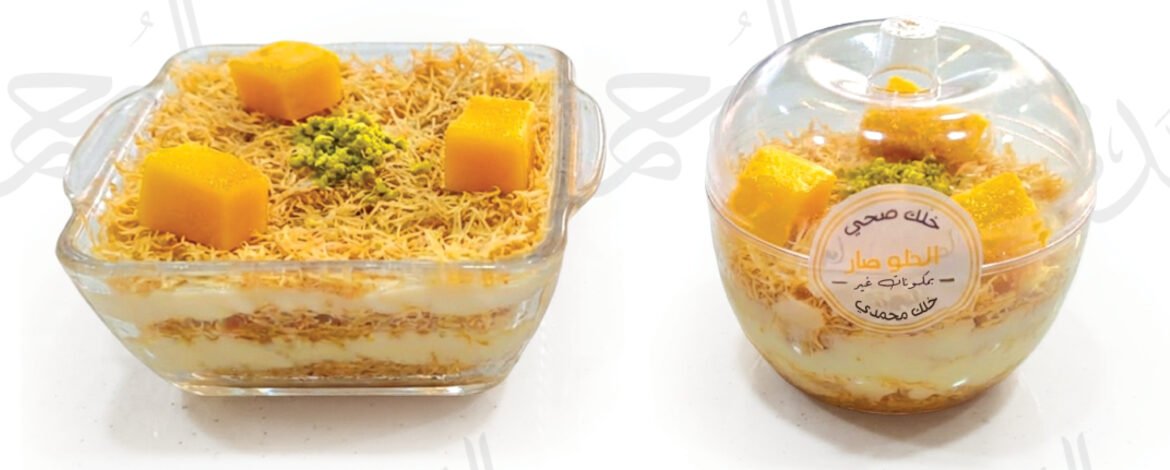 A delicious layered dessert combining crispy Kunafa and healthy almond cream, topped with fresh mango pieces.